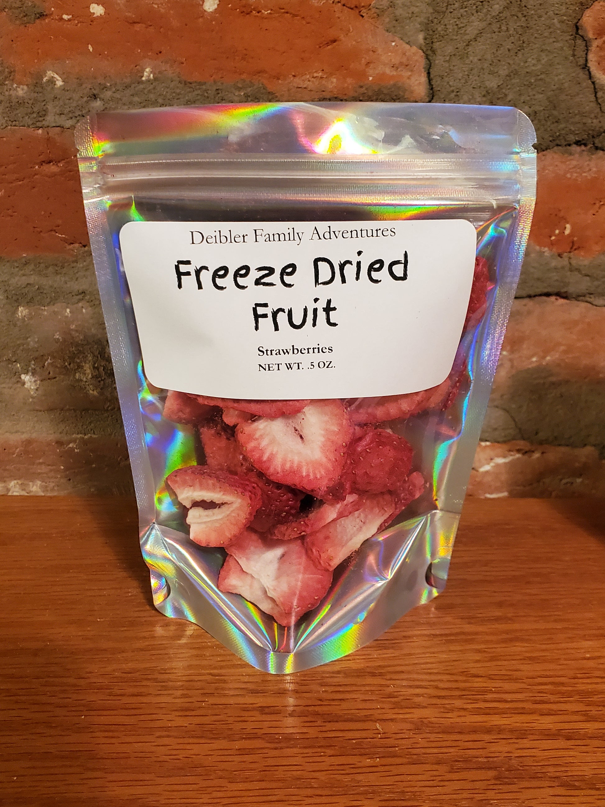 Freeze dried fruit is light and crispy. Freeze drying preserves 97% of the fruits nutrients versus dehydrated which preserves 60-75%. We make our strawberries from ripe fresh berries, never pre frozen from the the freezer section. Local fruit is always used when available.